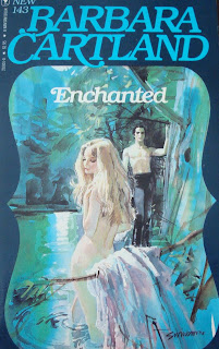 I like this cover that it shows our couple in a relaxed pose where it's evident that they are in love. We see an easel in the background and the stark rocky cliffs of the countryside. There is an illustrators signature in the lower left corner that I can't read: Swimburne, maybe.